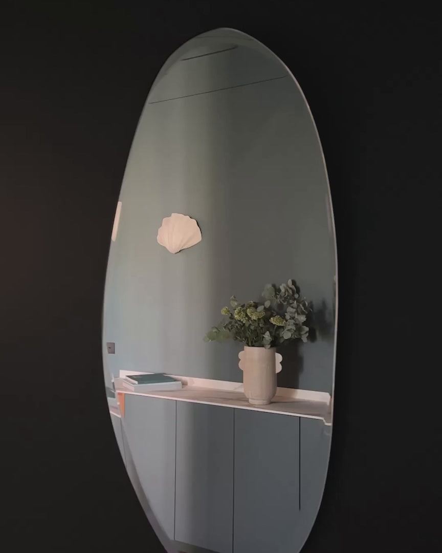 Ce jeu d’équilibre fait naître une création à la fois atypique et singulière, qui capte le regard et interroge les lignes du biseau lorsqu’on se déplace devant le miroir.