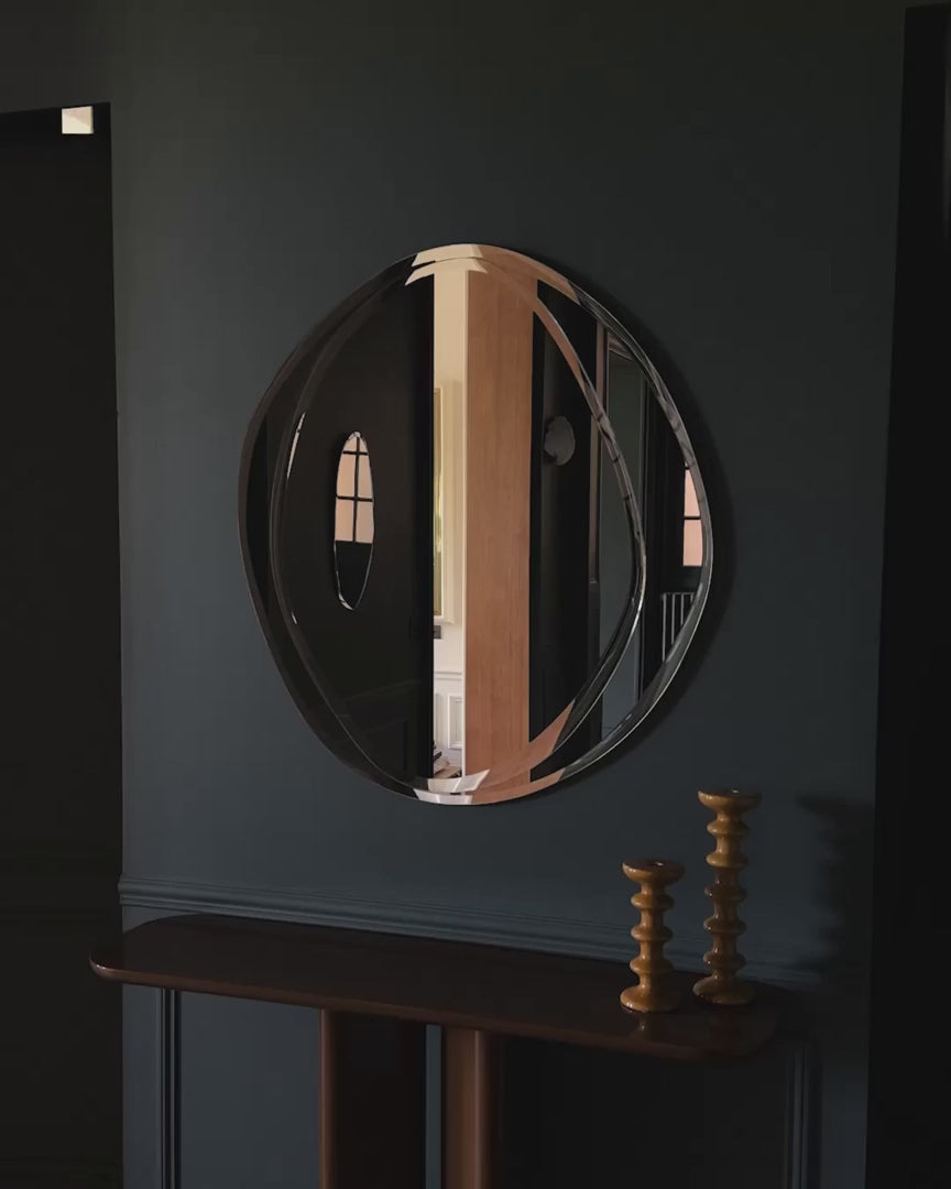 Ce double miroir crée un jeu de nuances et de reflets subtils, souligné par les deux biseaux irréguliers qui captent et dévient la lumière.
